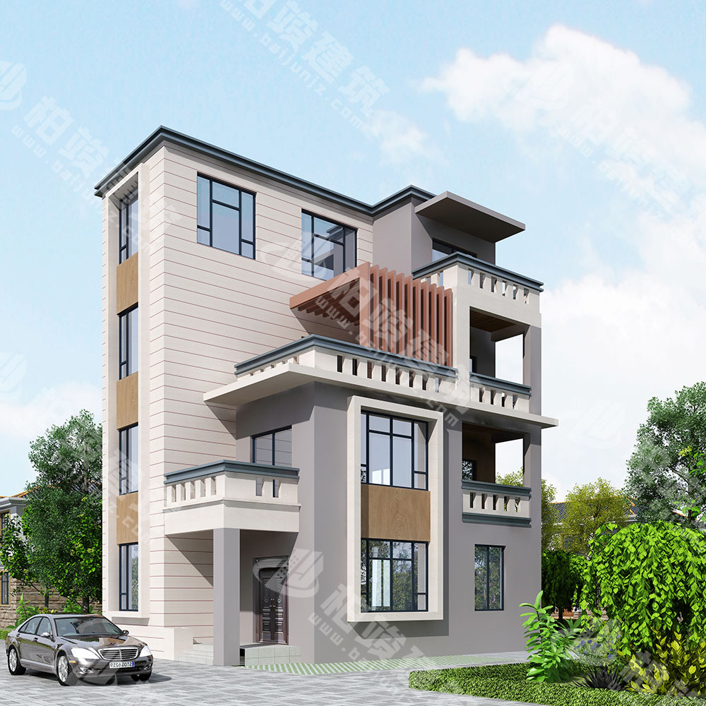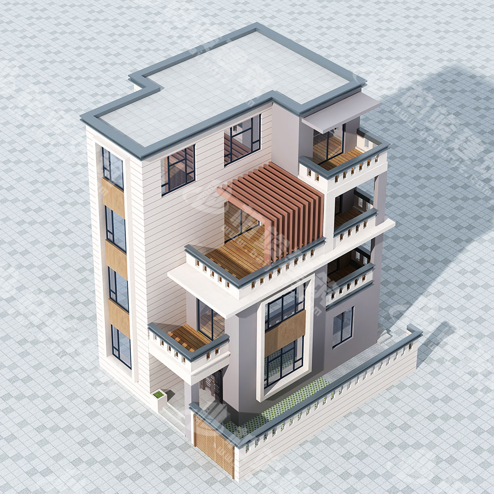 屋顶造型:大块地砖铺设平屋顶,设置女儿墙装饰立面,大气美观